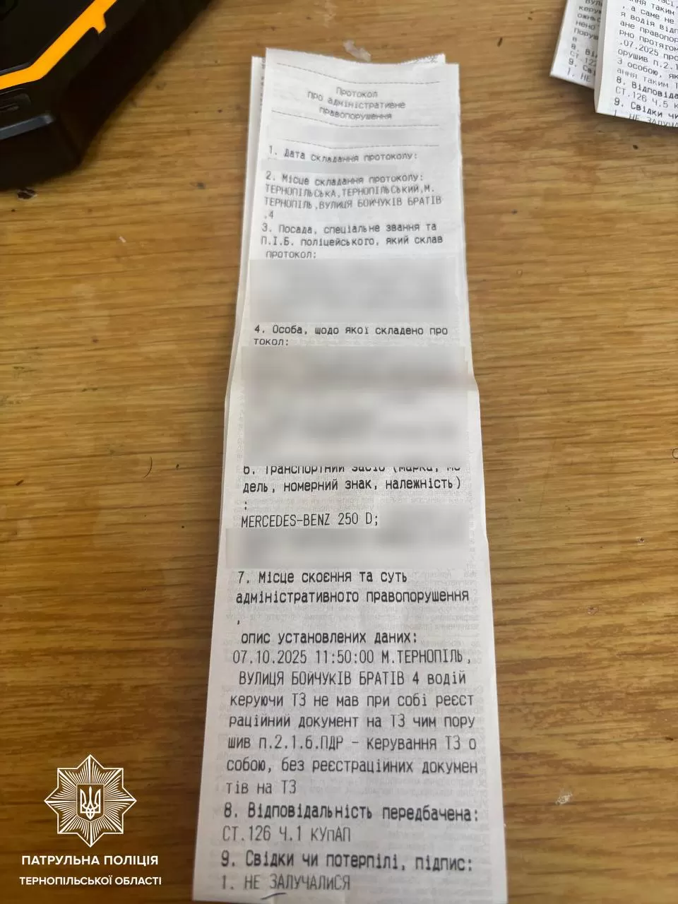 за ч. 1 ст. 126 (Відсутність свідоцтва про реєстрацію транспортного засобу) КУпАП;