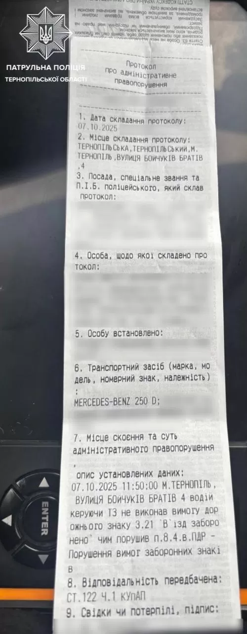 Водій автомобіля Mercedes-Benz проігнорував вимогу дорожнього знаку 3.21 “В’їзд заборонено”.