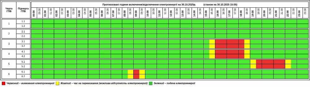 За вказівкою НЕК “Укренерго” 30 жовтня з 15:00 до 22:00 діятиме графік погодинних відключень.