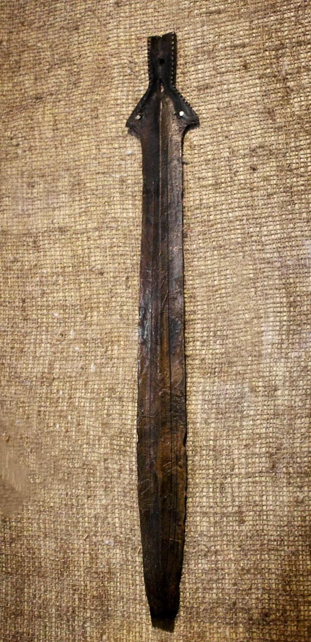 Меч виготовлено з першого штучного металевого сплаву — бронзи, технікою лиття. Верхня частина руків’я та кінець леза не збереглися. Руків’я має пряму форму, потовщене біля країв і звужене посередині. Його нижня частина розширена: краї виступають за межі леза у вигляді язиків-трикутників. Вздовж обох боків руків’я розташоване прямокутне зубчасте потовщення. Чотири наскрізні отвори слугували для кріплення дерев’яних накладок.