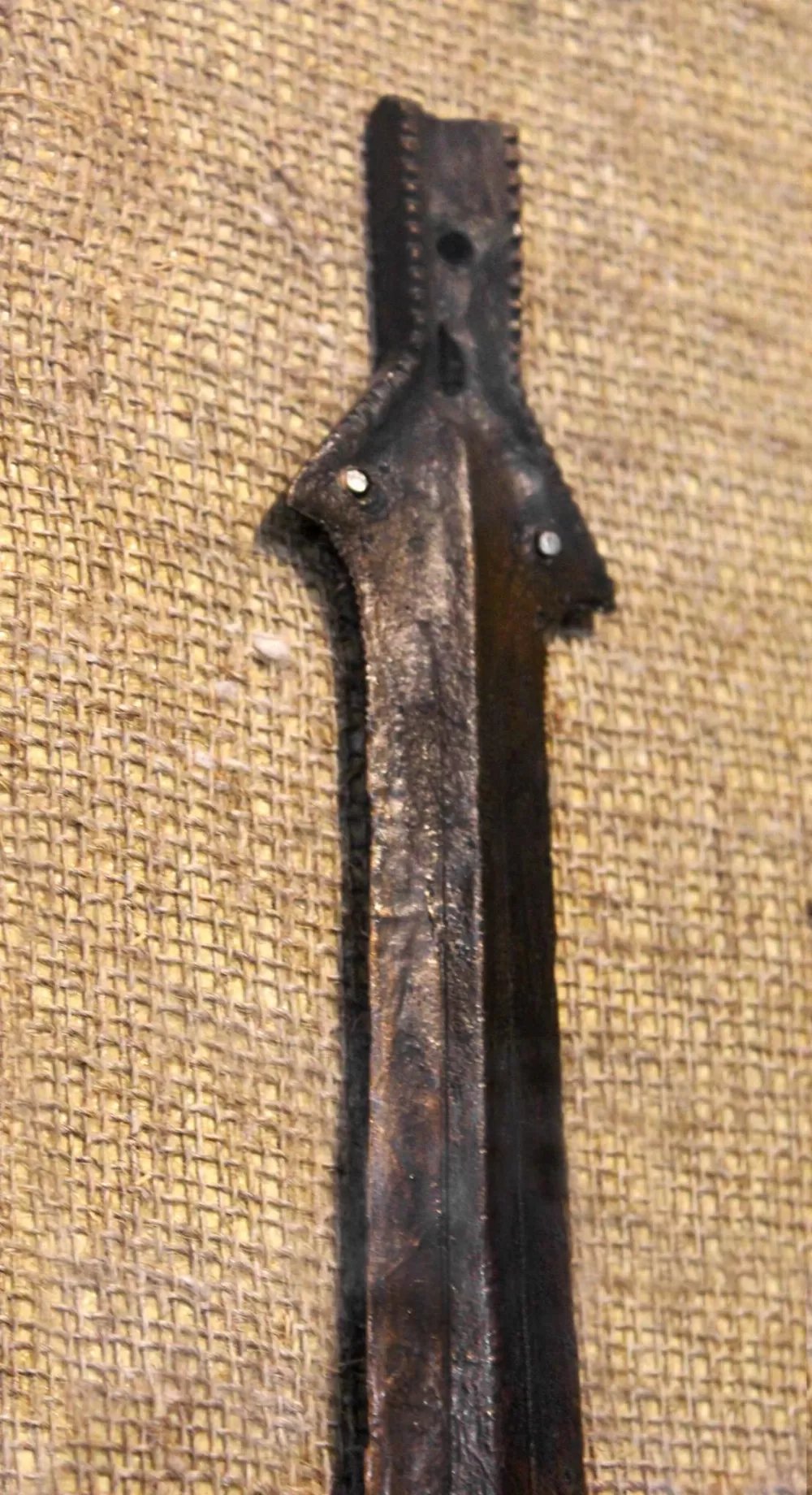 Лезо двосічне, розширене в нижній частині. Центральне ребро робить клинок ромбічним у перетині. Від руків’я до вістря з обох боків тягнуться два заглиблені жолобки, що могли мати як конструктивне, так і декоративне значення. Довжина збереженої частини меча разом з руків’ям становить 42,5 см, максимальна ширина леза — 3,5 см.