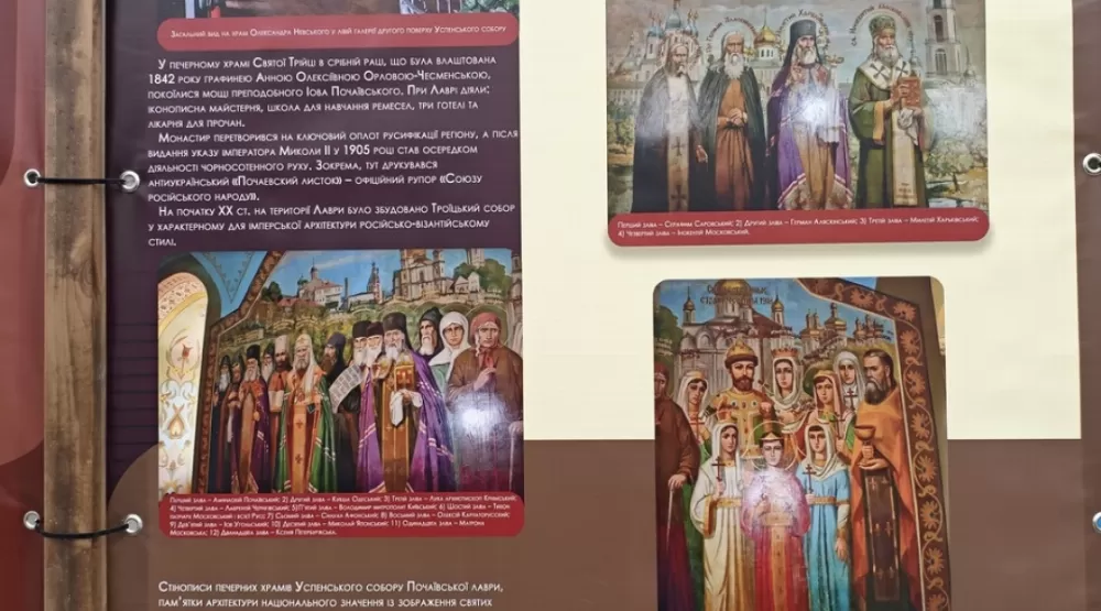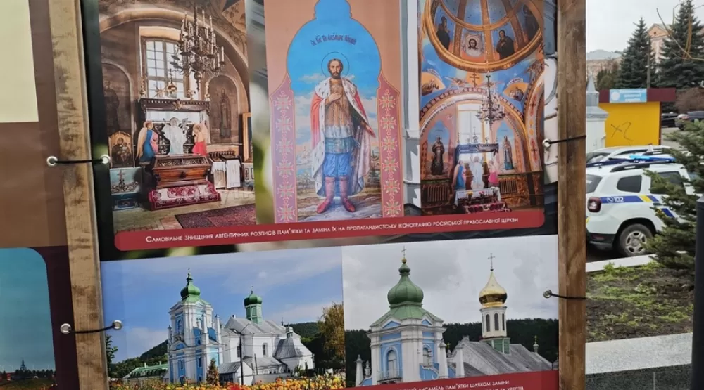На банерах виставки можна побачити зруйновані Росією під час війни українські храми, а також пошкодження пам’яток національного значення на території Тернопільщини, яке було здійснене УПЦ МП під час користування релігійними спорудами.