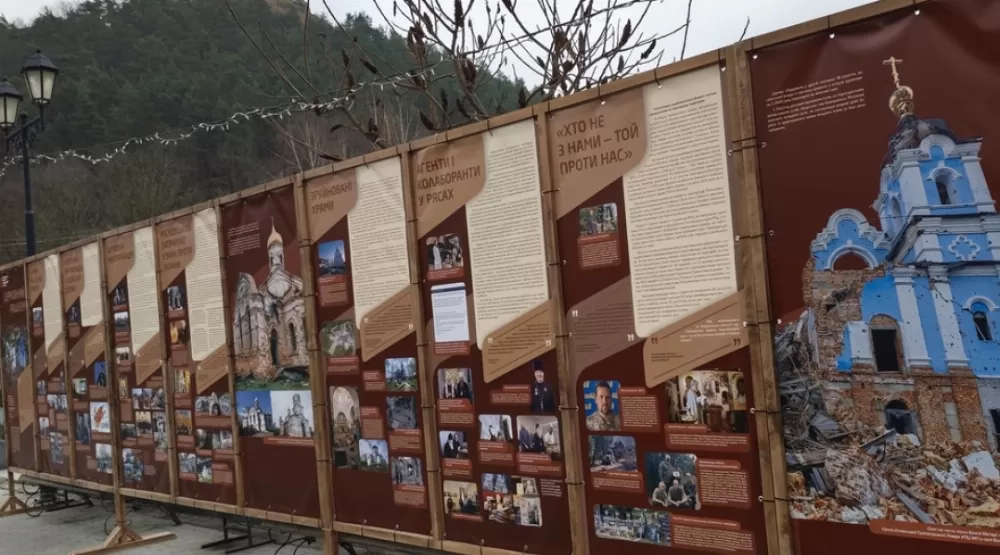 На банерах виставки можна побачити зруйновані Росією під час війни українські храми, а також пошкодження пам’яток національного значення на території Тернопільщини, яке було здійснене УПЦ МП під час користування релігійними спорудами.