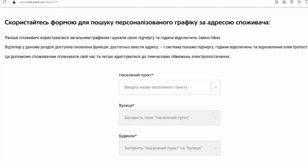тепер мешканці можуть переглянути графік лише за конкретною адресою, ввівши в спеціальне поле назву населеного пункту та адресу проживання.